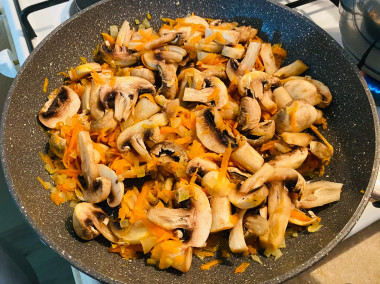 Обжаривайте грибы с овощами под крышкой минут 10 на небольшом огне. За это время грибы уменьшатся в размере.
