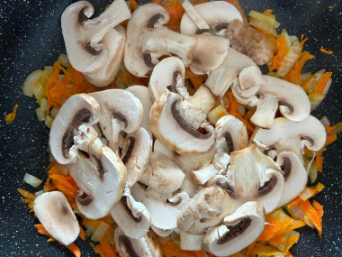 Шампиньоны промойте и нарежьте на ломтики. Добавьте их в сковороду к луку и моркови.