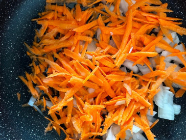 Лук и морковь очистите и ополосните в проточной воде от загрязнений. Лук мелко нарежьте, а морковь натрите на терке. На горячую сковороду налейте немного растительного масла и выложите измельченные лук и морковь. Обжарьте 3-4 минуты на небольшом огне.