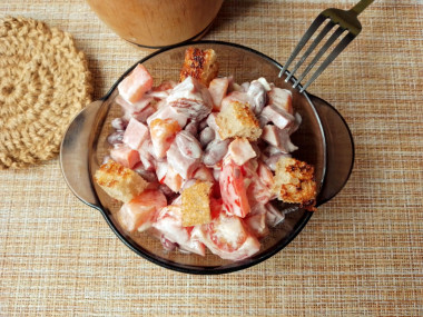 Если не планируете подавать салат сразу же или в ближайшие 10-15 минут, то сухарики и майонез лучше не добавляйте. Сухарики быстро размокнут и превратятся в хлебную кашу. Особенно быстро это произойдет с пшеничными сухариками. Все тщательно перемешайте и сразу же подайте к столу. Приятного аппетита!