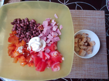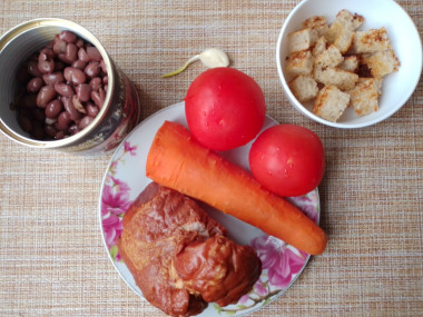 Как сделать салат с копченой грудкой, фасолью и сухариками? Очень быстро и просто. Для начала подготовьте необходимые ингредиенты по списку. Овощную часть салата можете дополнять по своему вкусу. Консервированную фасоль можете использовать как белую, так и красную или их смесь.