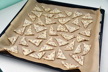Нравятся мне простые рецепты печенья, и один из таких этот рецепт льняного печенья с льняными семечками. Тесто замешалось очень быстро и легко, масло я выбрала оливковое. Дополнительно добавила немного базилика и розмарина. Молока ушло всего 130 грамм, больше добавлять не было нужды, тесто было очень приятным на ощупь, мягкое и не липнущее. У меня так же, как и у автора, получилось два противня небольших крекеров. Для каждой партии хватило по 20 минут на выпекание. На вид получилось симпатично: местами подзолотилось печенье и слегка пересушилось, где я тоньше нужного раскатала тесто