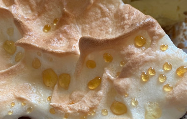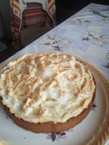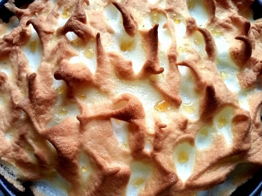 4. В данном пироге меренга представляет собой не классический плотный безе, а легкий, нежный слой, который придает блюду воздушность. Это задумка рецепта, где белковая шапочка играет роль контрастного текстурного дополнения к начинке и основе.