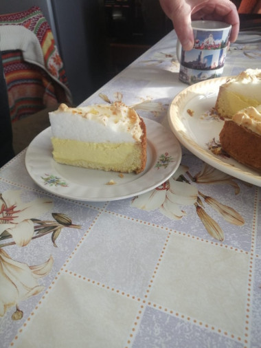 Первым делом я сделала основу. Очень хороший совет замесить тесто в блендере, это удобно. Тесто я положила не в холодильник, а в морозилку на 10 минут. Раскатала на пергаменте и перевернула пласт в форму. Руками распределила тесто по дну и бортикам. Бортики еще придавила вилкой. Пока делала начинку основа охлаждалась в холодильнике. Начинку взбила погружным блендером. Запекала 40 минут, форма у меня 20 см. в диаметре. Белки взбила с сахарной пудрой, от себя добавила лимонный сок. Меренгу выложила на горячий пирог и быстро распределила ложкой. Далее запекала под грилем 5 минут. Белки хорошо зарумянились, главное не спалить). Готовый пирог сразу накрыла большой чашей и оставила до остывания. "Слезки" появились! Это волшебный момент!