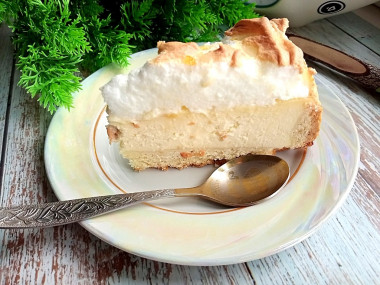 Поначалу, сразу после извлечения пирога из духовки, верхний слой действительно напоминает безе: поверхность покрыта плотной корочкой, которая может даже слегка ломаться при постукивании. Однако под этой корочкой находится влажная творожная масса, которая препятствует полному высыханию белковой шапочки.