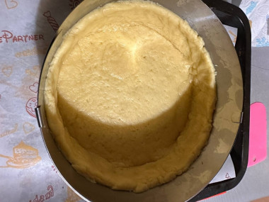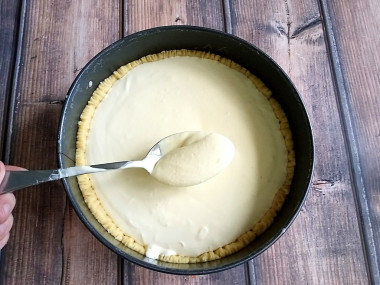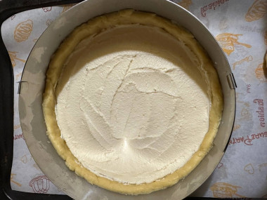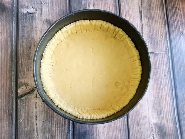 Выложите тесто в застеленную промасленным пергаментом разъемную форму или кольцо, формируя высокие бортики. На самом тесте не должно быть никаких дырочек, через которые могла бы протечь начинка.