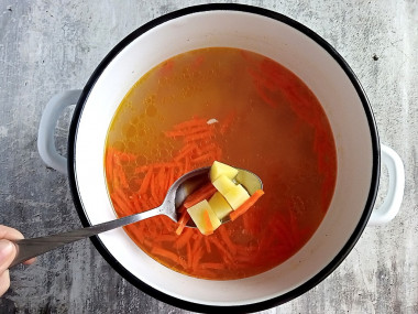 Варите суп еще 5-7 минут при слабом кипении. В самом конце разваренную луковицу выньте. Кастрюлю уберите с огня и дайте супу настояться 10 минут под крышкой.