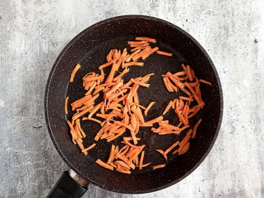 В сковороде на среднем огне разогрейте растительное масло. Выложите морковь и жарьте, помешивая, 4 минуты.