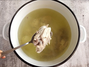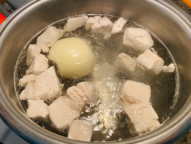 В кастрюле вскипятите 1,5 л воды на среднем огне. Выложите куриное филе и целую очищенную луковицу и варите, снимая пену и периодически помешивая, около 20 минут. Если у вас мясо с костью, то варите не менее 30 минут.