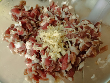 Мясо и свежее сало нарежьте острым ножом от руки на мелкие кусочки. Чтобы сало лучше резалось, поместите его на некоторое время в морозильную камеру. Слегка подмороженное сало (как и мясо) нарезается без особого труда.