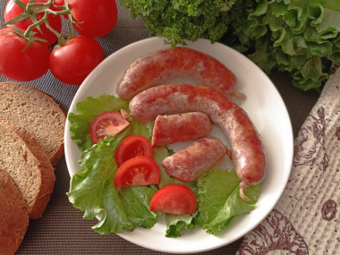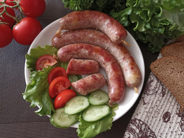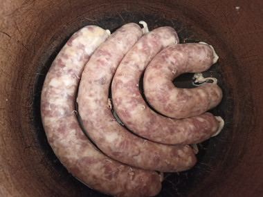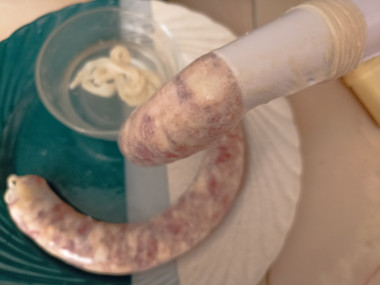Фарш ещё раз перемешайте и с помощью специальной насадки начините кишки. Размер колбасы может быть любым по вашему желанию. Слишком плотно не наполняйте оболочку, иначе она лопнет в процессе приготовления. В готовых колбасках сделайте несколько проколов чистой иглой или зубочисткой, чтобы выпустить лишний воздух.