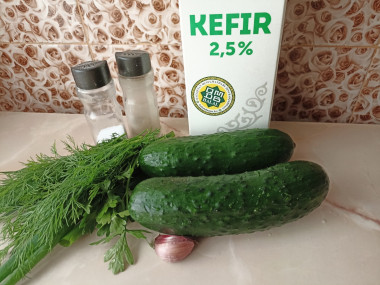 Как сделать холодный суп на кефире с огурцом? Очень просто и быстро. Для начала подготовьте необходимые ингредиенты по списку. Кефир можете брать любой жирности. У меня 3,2%.