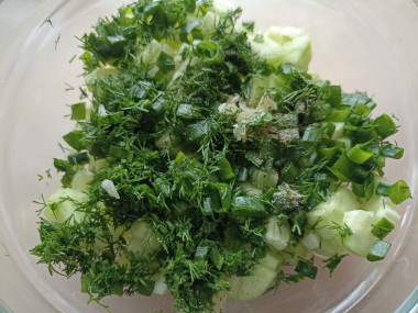 В миске соедините нарезанные огурцы, зелень и чеснок.
