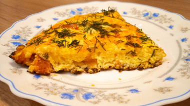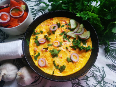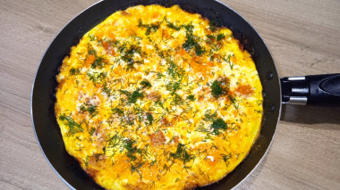 Готовый омлет снимите с огня и подавайте к столу в горячем виде. При подаче посыпьте омлет измельченной зеленью. Приятного аппетита!