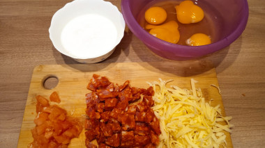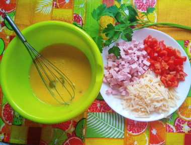 Как сделать омлет с ветчиной и сыром на сковороде? Подготовьте для этого необходимые ингредиенты. количество и пропорции ингредиентов полностью зависят от ваших предпочтений. Можно добавить больше ветчины с помидорами или больше яиц с сыром.