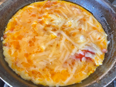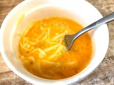 В яичную массу добавьте сыр, натертый на терке. Сыр можно использовать любой, главное, чтобы он хорошо плавился и легко терся на терке. Смешайте сыр с яйцами.
