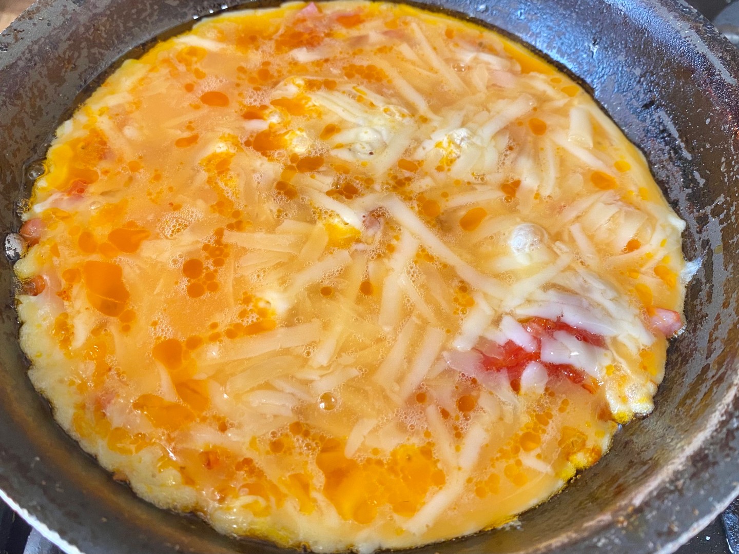 Залейте ветчину с помидорами яичной массой и накройте сковороду крышкой. Готовьте омлет на маленьком огне 5-7 минут. За это время все ингредиенты успеют пропечься. Главное - не надо делать большой огонь, чтобы омлет не начал подгорать.