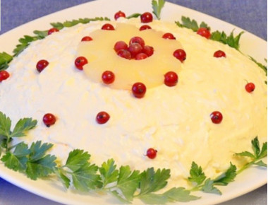 Перед подачей кулинарное кольцо аккуратно снимите. Сверху можете дополнительно украсить салат по своему вкусу. Я сделала цветок из колечка ананаса и ломтиков красного лука. Приятного аппетита!