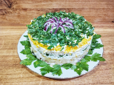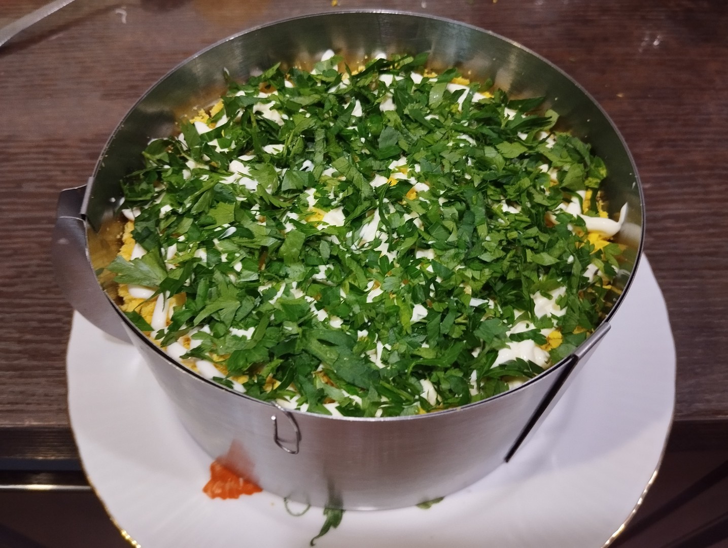 И последний слой - оставшаяся рубленая зелень. Поставьте салат на 1-2 часа в холодильник для пропитки.