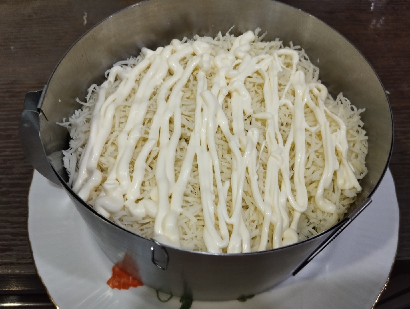 Еще один слой - тертые желтки. Я сразу натирала их на терке поверх сыра.