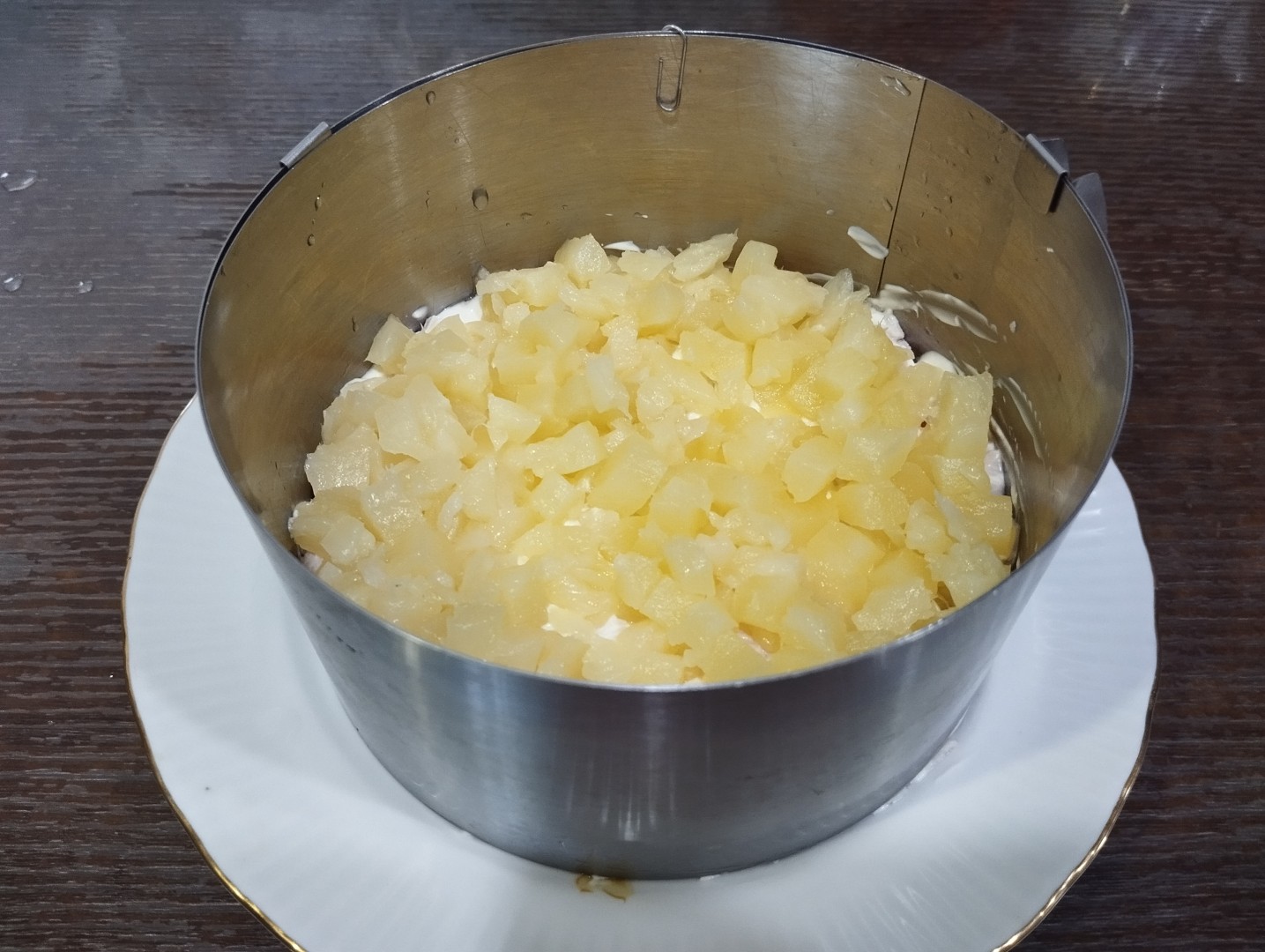 Следующий слой - консервированные ананасы. Их тоже полейте майонезом.