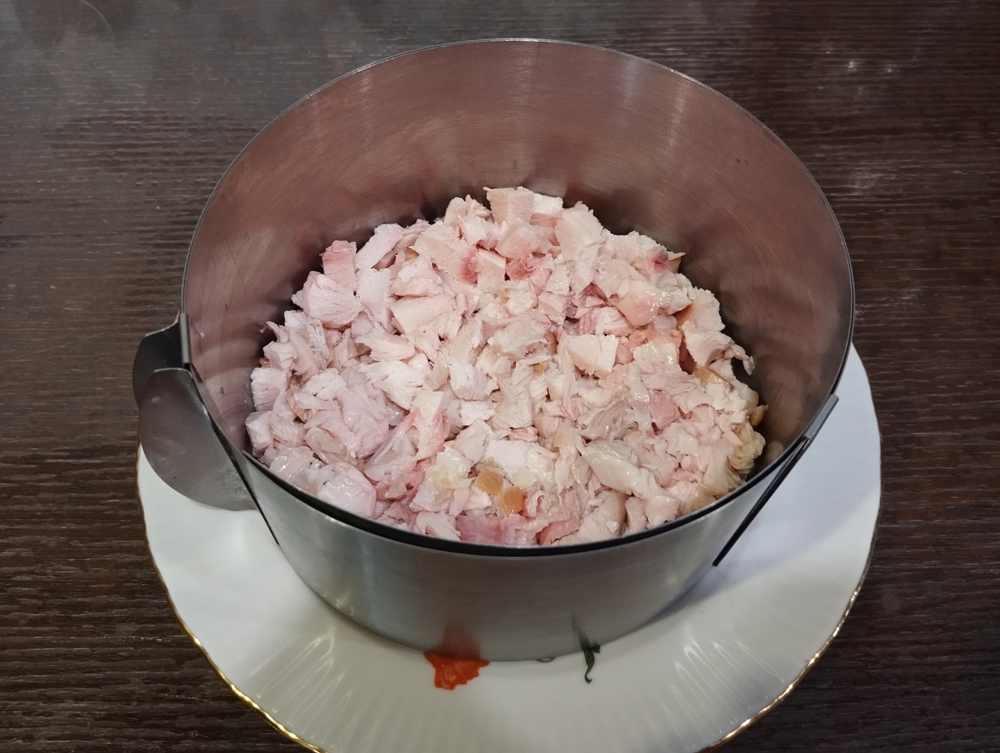 Можете просто смешать все ингредиенты в салатнике, но я предпочитаю делать салат в кулинарном кольце, чтобы были видны все слои. Подойдет кольцо диаметром 14-16 см. Первым слоем выложите копченую курицу и полейте ее майонезом. Я переложила майонез в кондитерский мешок и отрезала кончик. Так удобнее, чем ложкой.