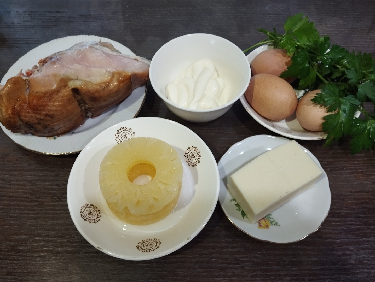 Калорийность продуктов: Копченая курица, Ананасы, Твёрдый сыр, Яйца, Петрушка, Укроп, Майонез