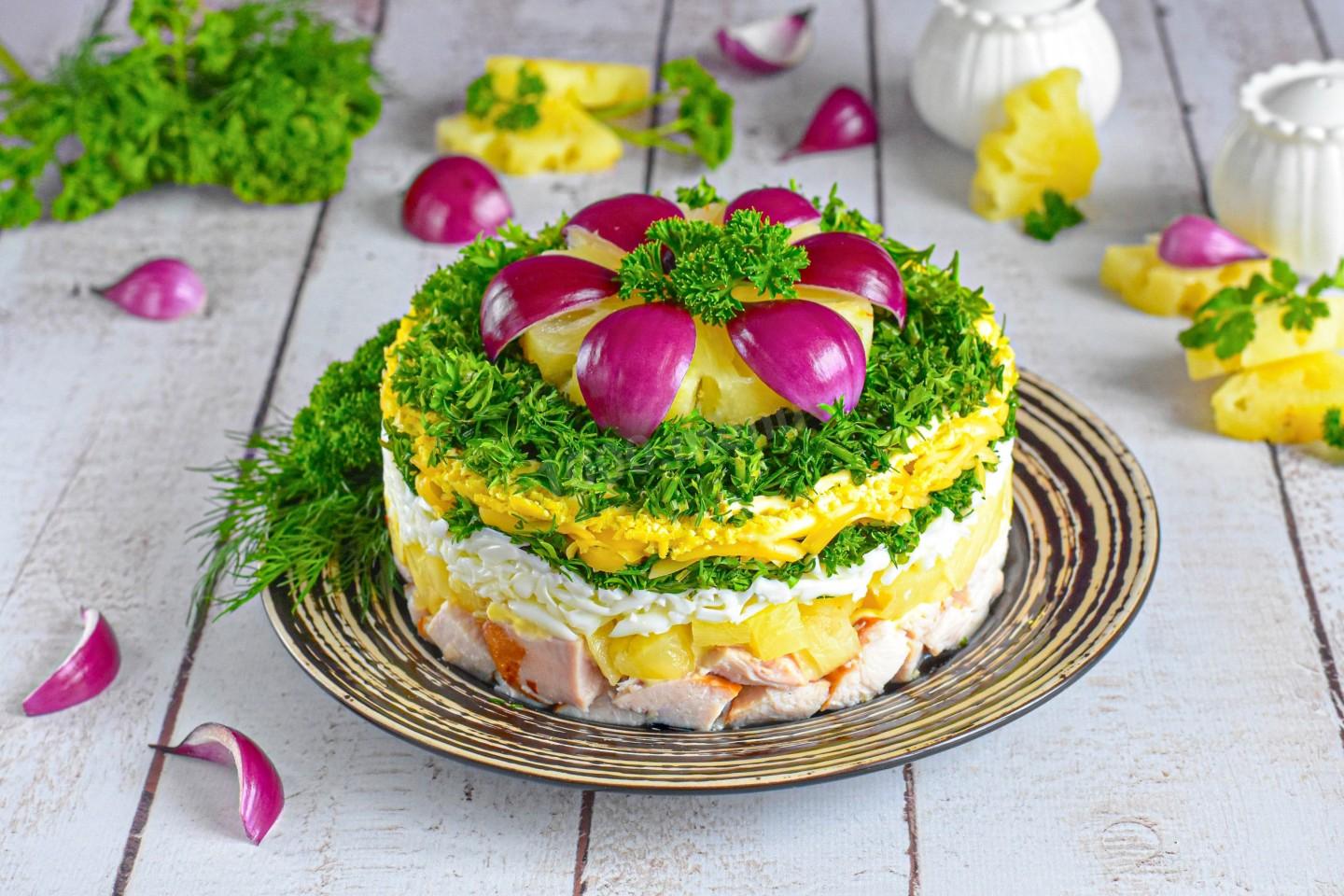 Перед подачей кулинарное кольцо аккуратно снимите. Сверху можете дополнительно украсить салат по своему вкусу. Я сделала цветок из колечка ананаса и ломтиков красного лука. Готовый салат, заправленный майонезом, храните закрытым в холодильнике не более 12-14 часов. Приятного аппетита!