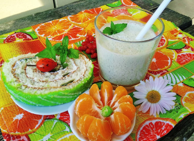 На завтрак готовлю вот такой смузи из киви, банана и молоко.