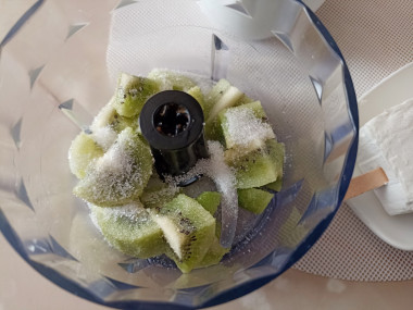 В чашу блендера выложите кусочки киви. Всыпьте сахар и ванильный сахар. Ванильный сахар в коктейль добавлять не обязательно, кладите его по вкусу.