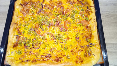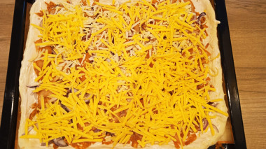 Сыр натрите на мелкой терке и полностью засыпьте им верх пиццы.