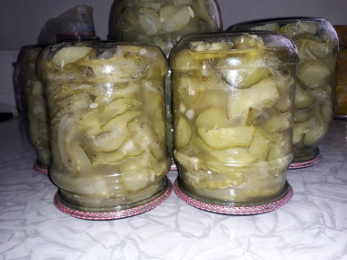 Отличный салатик выступит зимой в роли пикантной закуски! Вкус очень приятный, огурчики хрустящие. Готовятся такие огурцы с луком на зиму несложным способом, продукты используются самые обычные, пошаговый рецепт помог мне сделать все на высшем уровне. Большое спасибо за рецепт!