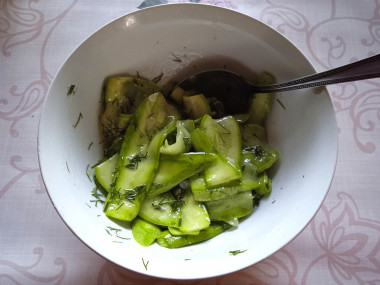 Кабачки слегка отожмите рукой, выделившийся сок слейте. Залейте их маринадом. Хорошо перемешайте кабачки, можно сделать это руками. Оставьте их на 2-3 часа постоять. Закуска из маринованных кабачков с медом быстрого приготовления готова. Можете подавать ее к столу.