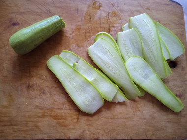 Кабачки помойте, обсушите и отрежьте кончики. Нарежьте их тонкими ломтиками. Способ нарезки не важен — можете резать кружочками, половинками, тонкими лентами и даже соломкой. Не делайте только ломтики слишком толстыми, чтобы они успели промариноваться.