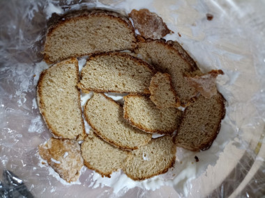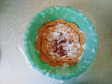 В миску с круглым дном постелите полиэтиленовую пленку. Чтобы пленка не скользила, немного смочите водой дно и бока миски. Смажьте слегка сметанным кремом дно и уложите кусочки пряника в один слой.