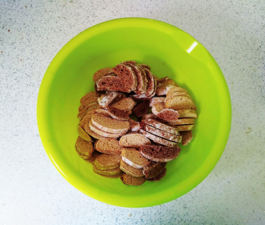 Пряники можете взять сахарные, шоколадные, ореховые - все зависит от вашего желания. Главное, чтобы они были свежими, ведь от них напрямую будет зависеть вкус торта. Отложите 2 пряника для приготовления крошки. Остальные пряники нарежьте на дольки толщиной примерно 0.5 сантиметра. Чем тоньше нарежете пряники, тем лучше они пропитаются кремом и тем нежнее получится торт.