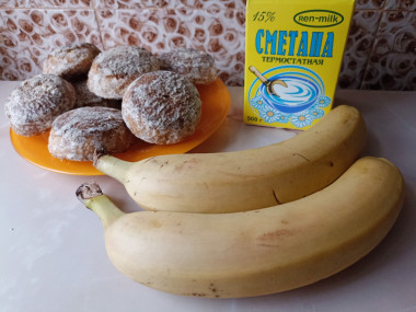 Как сделать торт из пряников с бананами и сметаной? Подготовьте все необходимые ингредиенты. Сметану можете взять любой жирности, но лучше, чтобы она была густой. Она должна быть натуральная, хорошего качества. Если сметана кажется вам слишком жидкой, переложите ее в сложенную в несколько слоев марлю, подвесьте на 2-3 часа в прохладном месте. С нее стечет лишняя жидкость, и сметана станет густой.