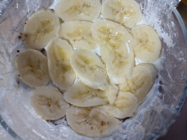 Бананы вымойте. Очистите один и нарежьте его тонкими колечками. Уложите на пряничный слой слой бананов. Не нужно сразу чистить и нарезать все бананы - на воздухе за это время они могут почернеть.