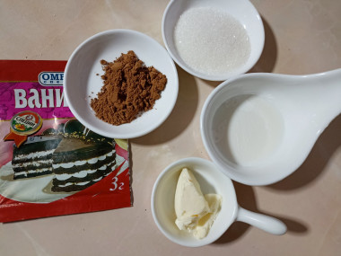 Начните варить глазурь. В маленький ковшик или кастрюльку влейте молоко, положите сливочное масло, добавьте какао, сахар и ванилин, перемешайте. Поставьте на медленный огонь и варите 5 минут до однородной массы.