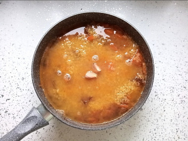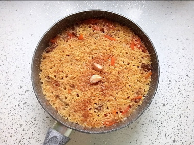 Накройте казан крышкой. После появления признаков закипания плиту убавьте до умеренного и готовьте примерно 20-25 минут. За это время крупа полностью впитает воду, а говядина дойдёт до полной готовности.