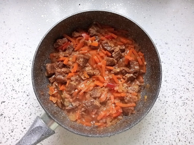 Затем отправила в сковороду лук кубиками, морковь соломкой и болгарский перец кусочками. Помидоров не было, заменила их на томатную пасту. Все вместе еще обжарила, а затем потушила 20 минут. Мне нравится, когда мясо и овощи пропитываются соками, так вкус блюда становится более насыщенным.