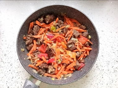 Добавьте к мясу болгарский перец, лук и морковку. Помешивая, готовьте от 5 до 7 минут.