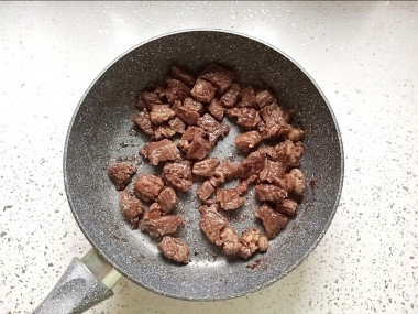 Кусочки мяса сначала обжарила на сильном огне, чтобы они хорошо подрумянились снаружи. Так сок остается внутри и мясо получается мягким и сочным.
