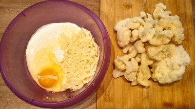 Как запечь цветную капусту в сметане в духовке? Подготовьте необходимые ингредиенты. Цветную капусту для такого блюда можно взять свежую или замороженную, только ее нужно предварительно разморозить и слейте жидкость. Сметана может быть любой жирности. Твердый сыр подойдет Российский или любой другой, главное, чтобы он был качественным, вкусным, хорошо плавился в духовке. Куриное яйцо берите крупное, если яйца мелкие то возьмите два.