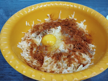 Картофель натрите на той же терке и добавьте к кабачку. Овощи посолите, поперчите и разбейте яйцо. Все хорошо перемешайте.