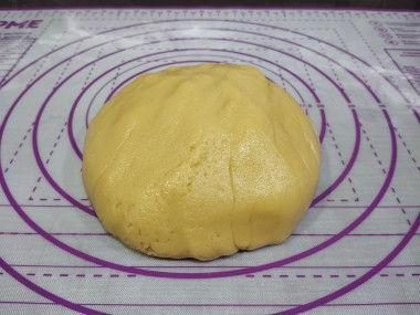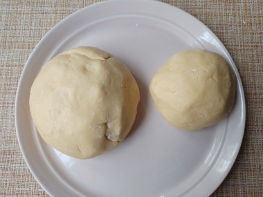 Долго месить песочное тесто не надо, иначе оно забьется мукой и станет твердое. Как только тесто стало собираться в шар и перестало липнуть к рукам, муку больше не добавляйте. Готовое тесто разделите на две неравные части. Меньшую часть уберите в морозилку на 1-1,5 часа, чтобы оно стало твердое.