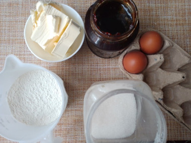 Как сделать кудрявый пирог с вареньем? Подготовьте для этого необходимые ингредиенты. Яйца я использую категории С1. Вместо сливочного масла можно использовать маргарин. Но учитывайте, что именно использование сливочного масла делает структуру песочного теста более рыхлой и рассыпчатой. Муку просейте через сито, чтобы насытить её кислородом.