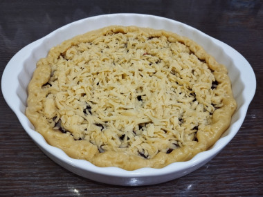Из морозилки вытащите замороженное тесто и натрите его на терке по всей поверхности пирога. Тертое тесто похоже на кудряшки. Поставьте пирог в духовку, предварительно разогретую до 190 градусов на 30-40 минут. Ориентируйтесь по своей духовке.