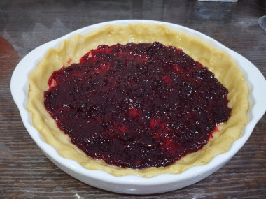 По всему тесту распределите густое варенье. У меня варенье из черной смородины. Лишние бортики можно подвернуть на варенье сверху.