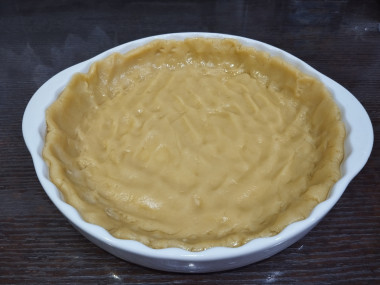 Дно разъемной формы для выпечки (26-28 см) застелите пергаментом. По всей поверхности распределите большую часть теста и сформируйте небольшие бортики.